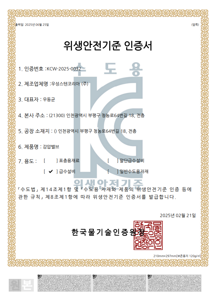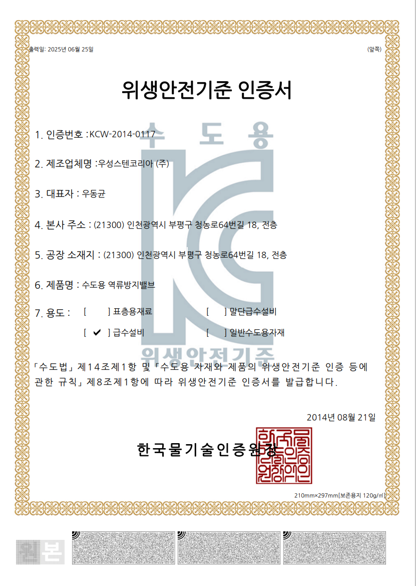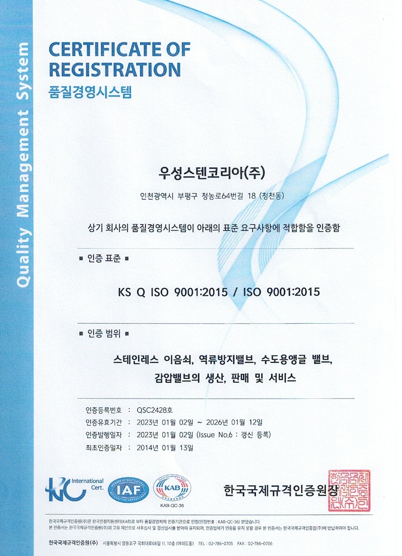 인증현황 (Certificates) 저희 회사의 제품 생산 및 품질, 특허와 관련한 인증현황입니다.Here are our certifications related to product manufacturing, quality assurance, and patents. 인증서Certificates KC (위생안전기준) 인증서 앵글밸브 Angle Valves KC (위생안전기준) 인증서 역류방지밸브 Check Valves KC (위생안전기준) 인증서 스테인리스 강관 이음쇠 Pipe Fittings KC (위생안전기준) 인증서 감압밸브 Water Pressure Reducing Valves ISO 9001 인증서 : 스테인리스 이음쇠, 역류방지밸브, 수도용 앵글밸브, 감압밸브 생산, 판매 및 서비스 메인비즈 (Main-Biz) 인증서 특허증(Patent Certificate)배관이음장치 특허증(Patent Certificate)수도배관장치 디자인등록증 (Design Registration Certificate) 수도계량기 보호통 디자인등록증 (Design Registration Certificate) 수도계량기의 역류방지밸브용 볼